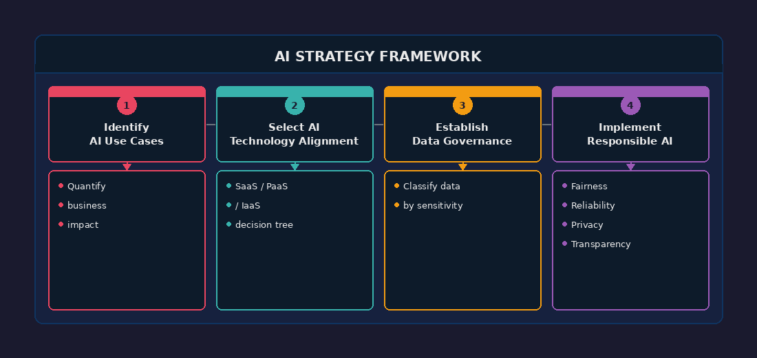 Microsoft's Cloud Adoption Framework prescribes four pillars for an AI strategy. Map each pillar to concrete deliverables before writing any code.
