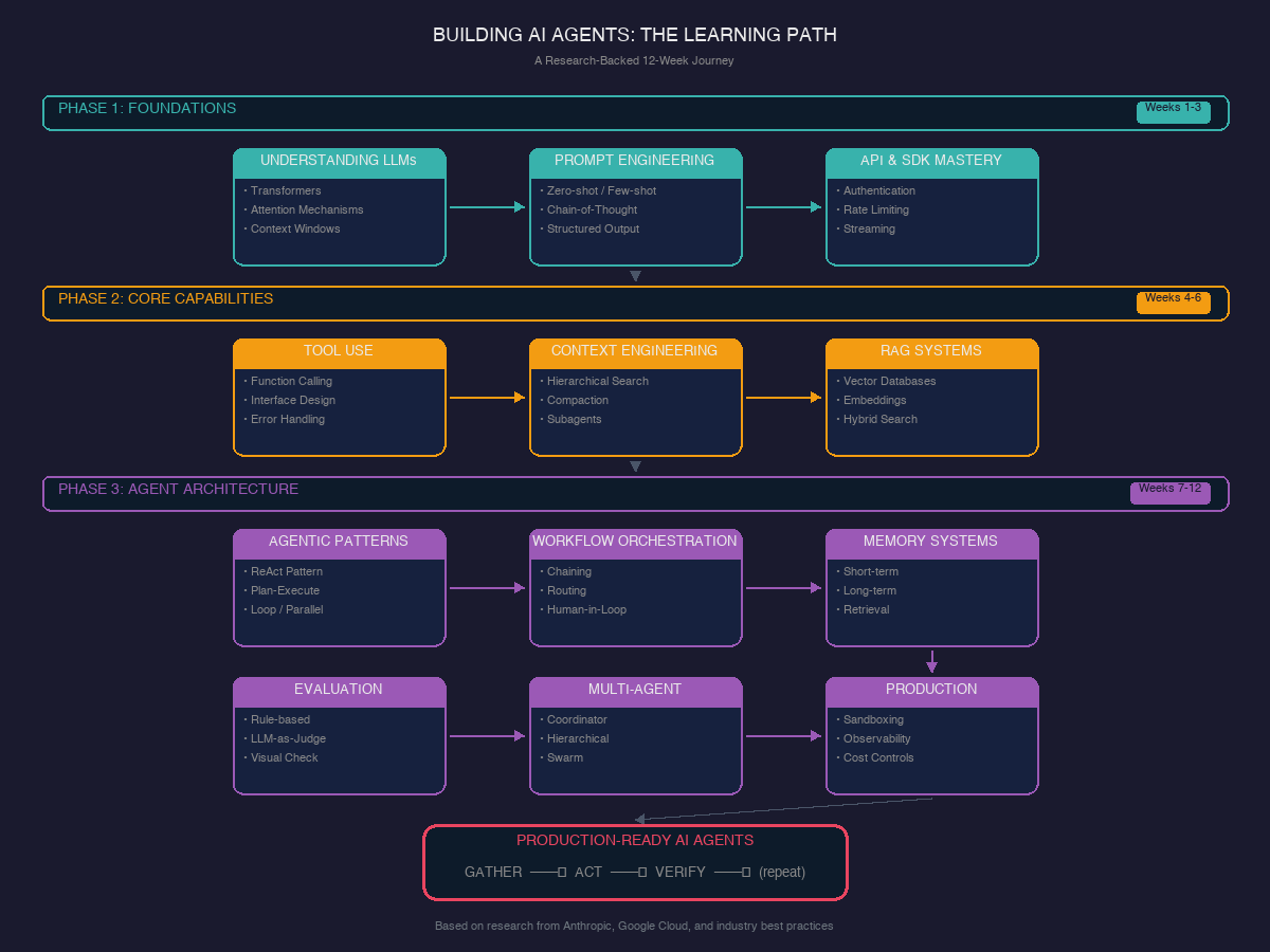 | Phase 3 | Agent Architecture | Weeks 7-12 | Patterns, Workflows, Memory, Evaluation, Multi-Agent, Production |